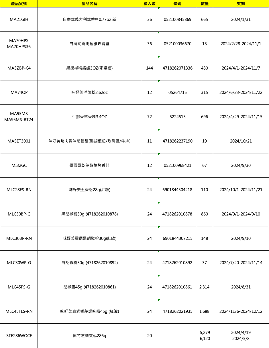 | 白胡椒粉30g (4718262010892) | 24 | 37 | 2024/7/20-2024/11/14 |